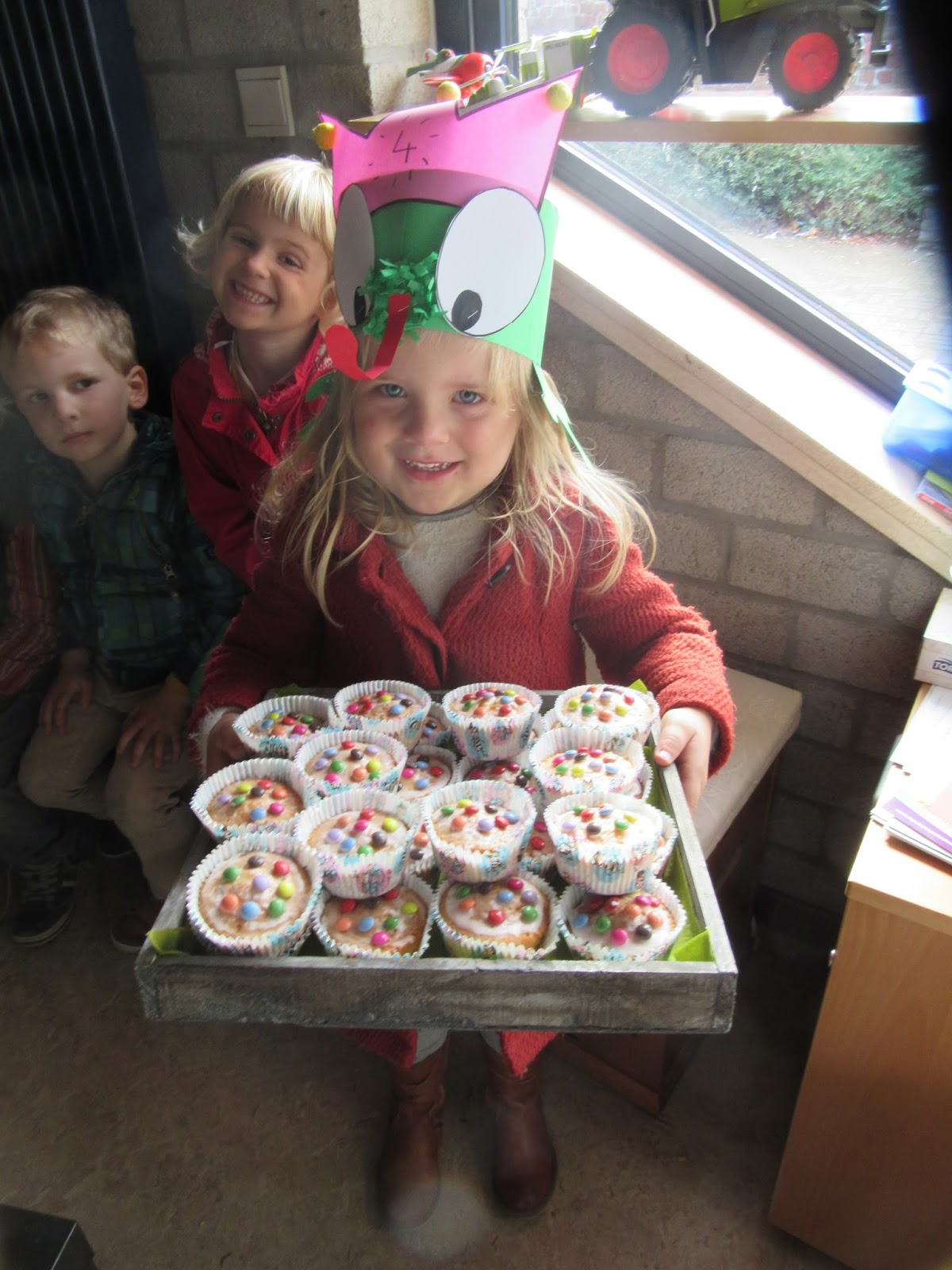 Toen we daar aan kwamen kregen we de uitleg dat de bijenkoningin gevlucht was omdat ze haar kroontje niet aan de nieuwe koningin wou geven. We moesten op zoek door de maïs naar de koningin. Maar de weg zoeken was niet zo simpel! Plots liep een weg dood en moesten we terug keren. Ondertussen mochten we bijtjes tellen. Van bloem tot bloem springen. Door gaatjes kruipen. Trampoline springen (maar deze was iets te nat).